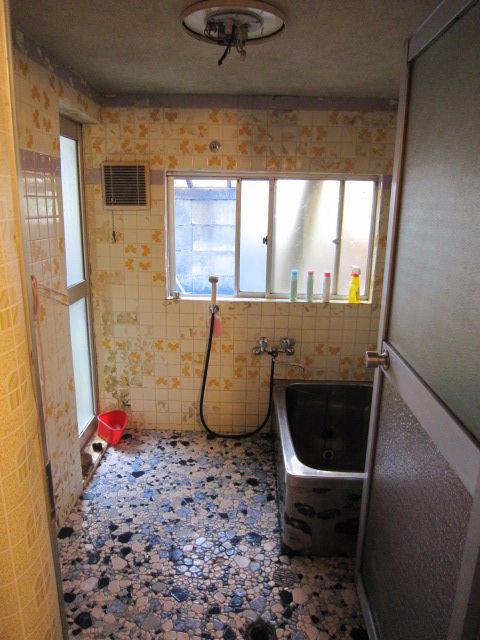 古い浴室はコンクリートブロックの上にタイルを貼ったお風呂でした。寒くて、段差も多く、安心・快適な浴室ではない状態です。脱衣室も狭く使い勝手があまり良くない状況でした。この浴室・脱衣室を快適な空間に変身させました。