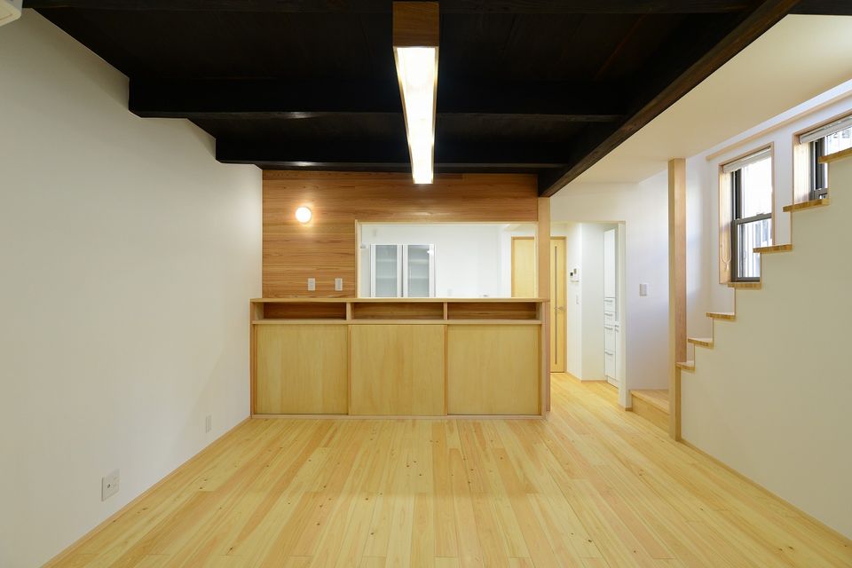 完成後のリビングです。床は新しく桧のフローリング、壁も全て新しく壁紙を貼っています。その中で天井の板は元々あった板を見せるかたちにしています。新旧を融合させたかたちは私たちの空間デザインの真骨頂ですが、天井高を最大限利用できると合理的な面もあります。
