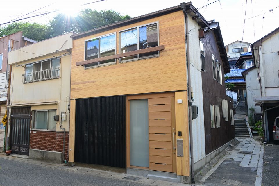 道路側全体を杉板で仕上ています。1階部分は建具と組み合わせて木製格子も設置しました。玄関袖にポストを組み込んだり、全体が整うように工夫をしています。