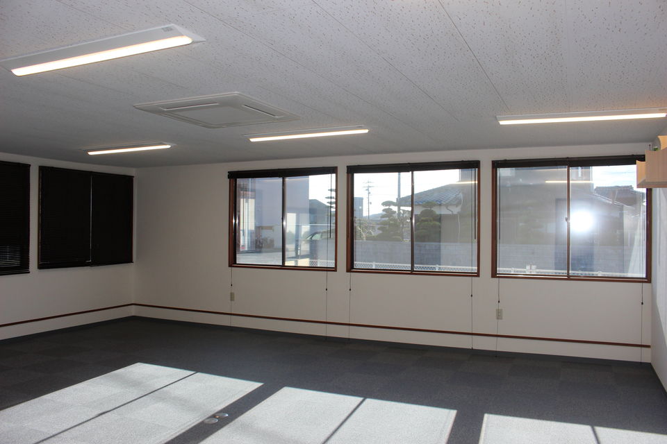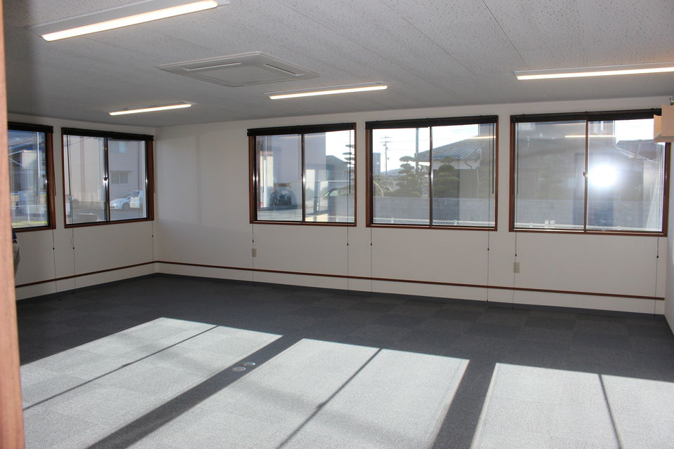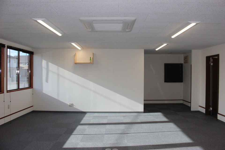 古い事務所はかなり内装が劣化していましたので、結愛は既存シート貼り床の上に木造で床組みを行い、タイルカーペットを貼りました。天井や壁は既存の上に塗装で化粧直しをしています。照明器具も蛍光灯からLEDに代えて、省エネ性も向上しています。