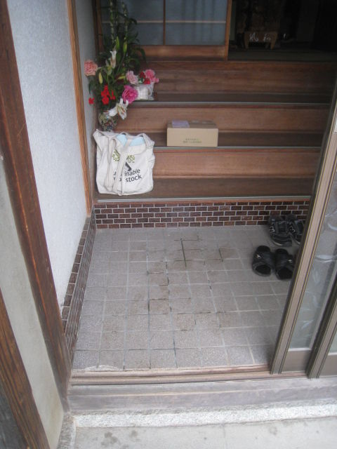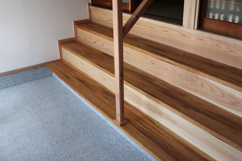 古くなったタイルの土間は、御影石の土間に。合板の階段板は無垢の地松板に改修しました。