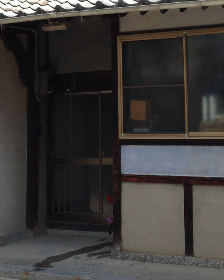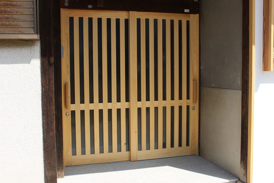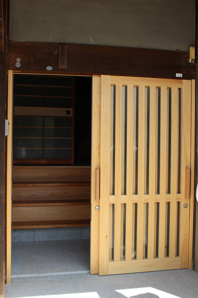 アルミの玄関戸も桧無垢材のガラス格子戸に変えています。