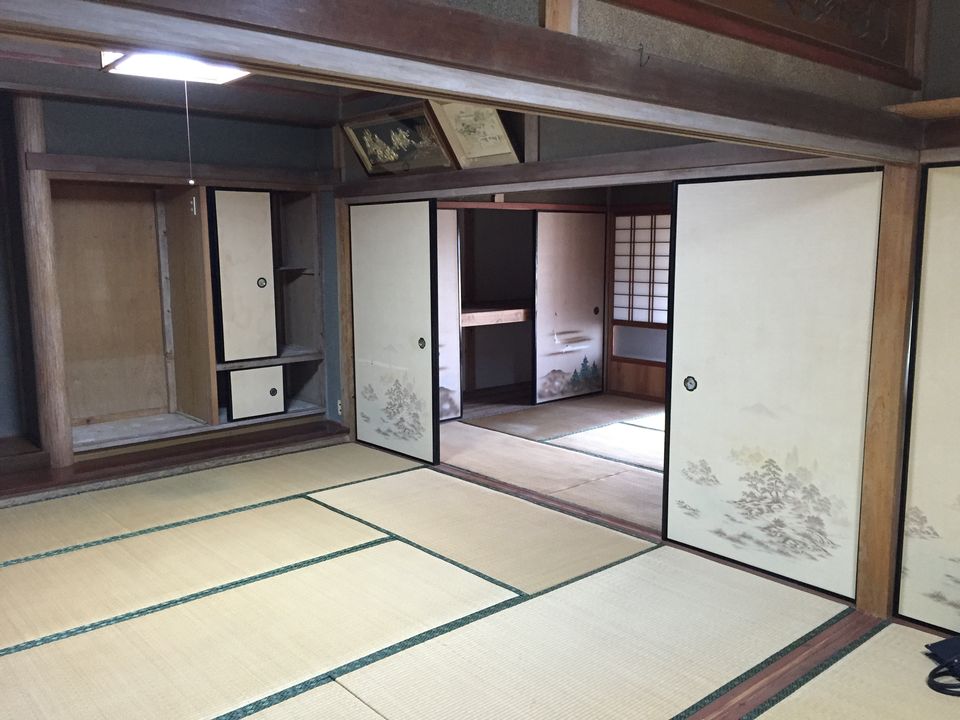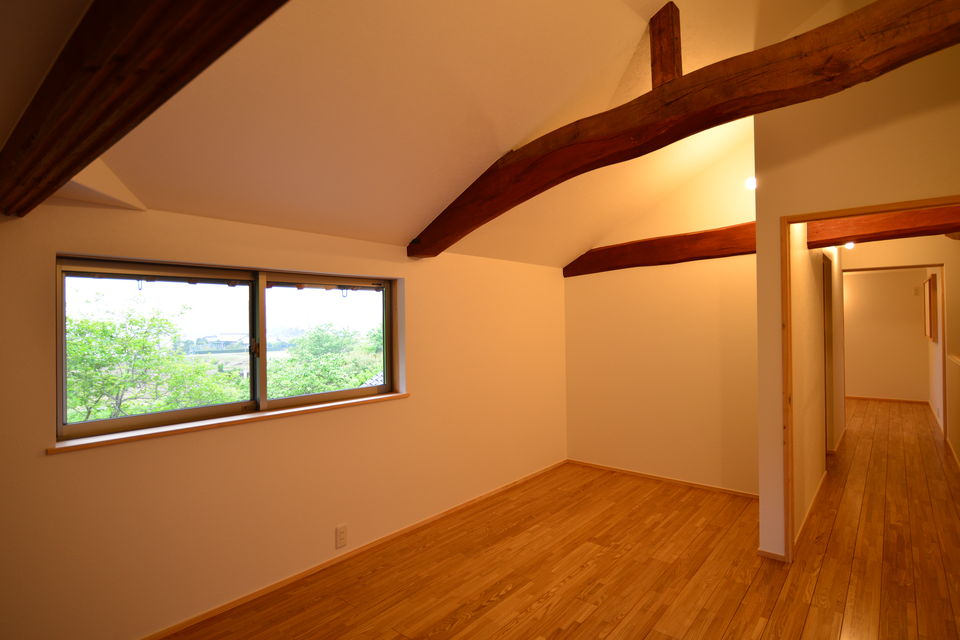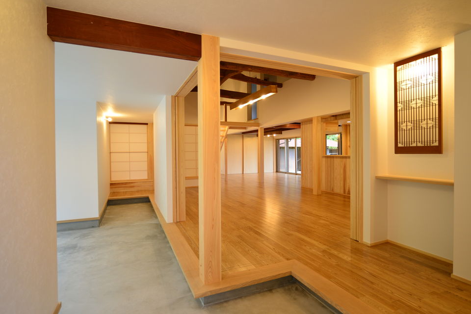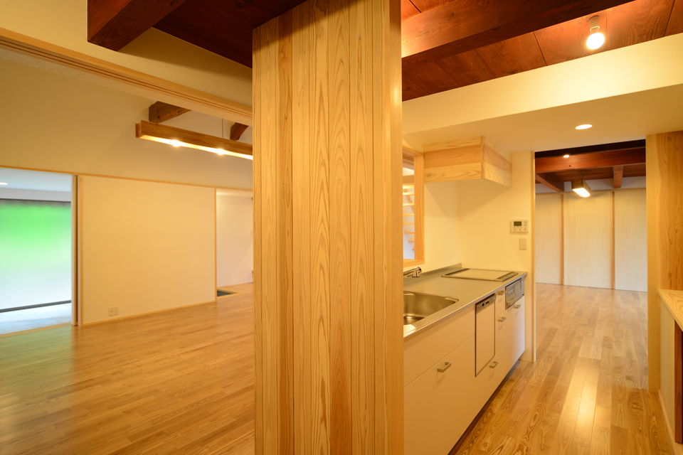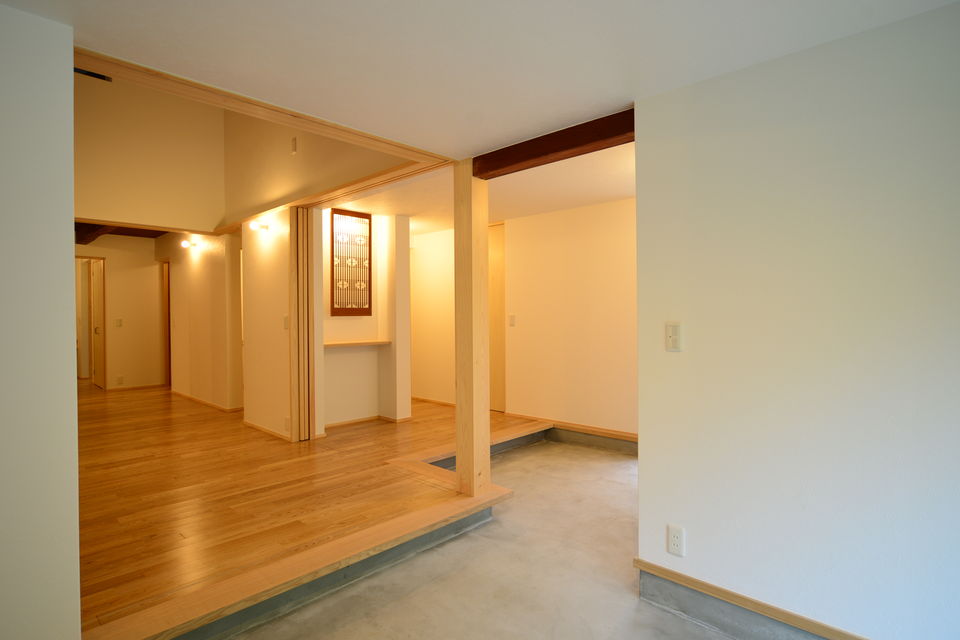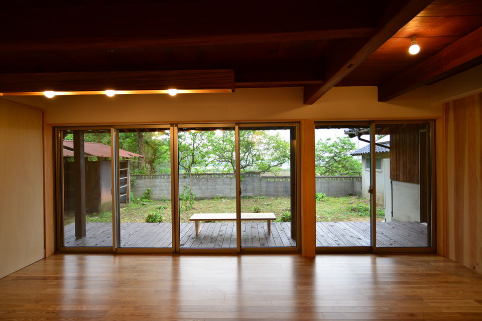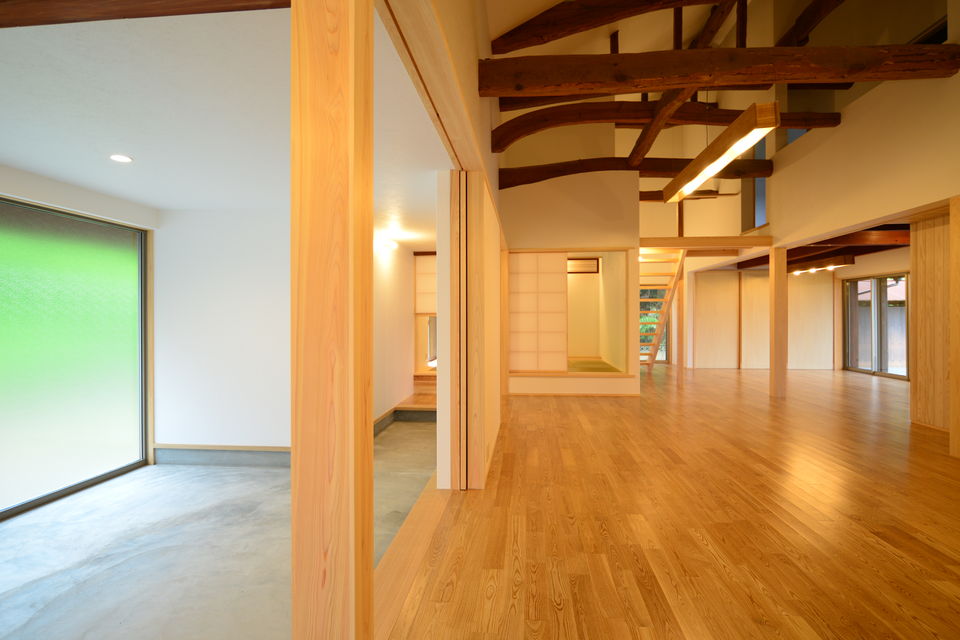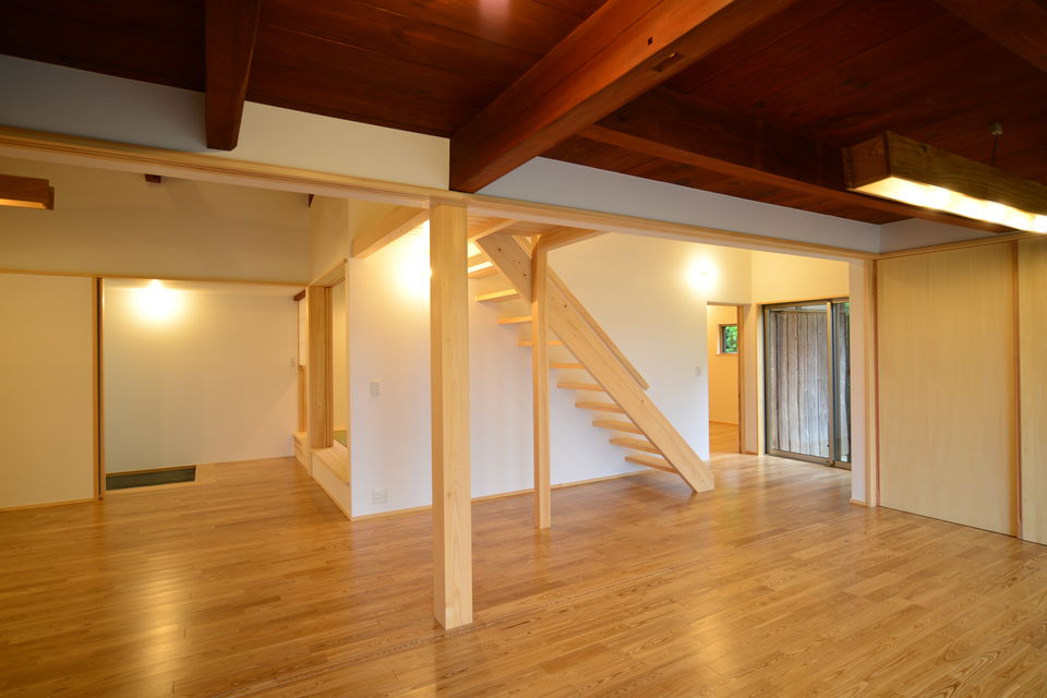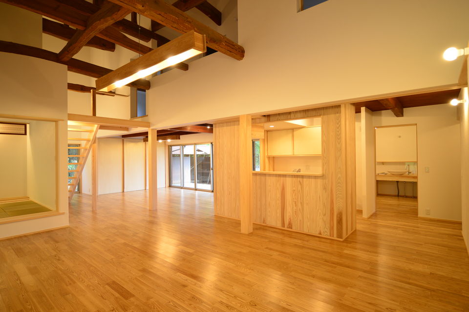 下関市豊浦町の築55年の古民家をフルリノベーションしました。祖父が建てた住まいを住み継ぎたいとの思いを酌取り、昔の面影を残しながら、快適な暮らしが営めるように改修工事を行っています。和室の続き間をLDKワンルームとし、上部の小屋裏空間も全て利用して大きな吹抜けを設けています。小屋組の梁などは現しとすることで、構造の力強さも表現することができました。床にはタモ材、造作材・階段はヒノキ、内装には杉板など、適材適所に木材を利用した空間としています。耐震性も現在の基準に適合させることで下関市の耐震助成金を受領することができました。断熱性も向上させることで、大空間を設けながら、「冬でも暖かいです」とのお声をいただきました。空間デザイン、性能リフォームの両立をした弊社の代表的な仕事となりました。