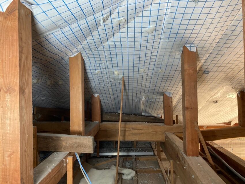 セルロースファイバー断熱施工の様子です。UA値を3.35→0.48に向上しています。