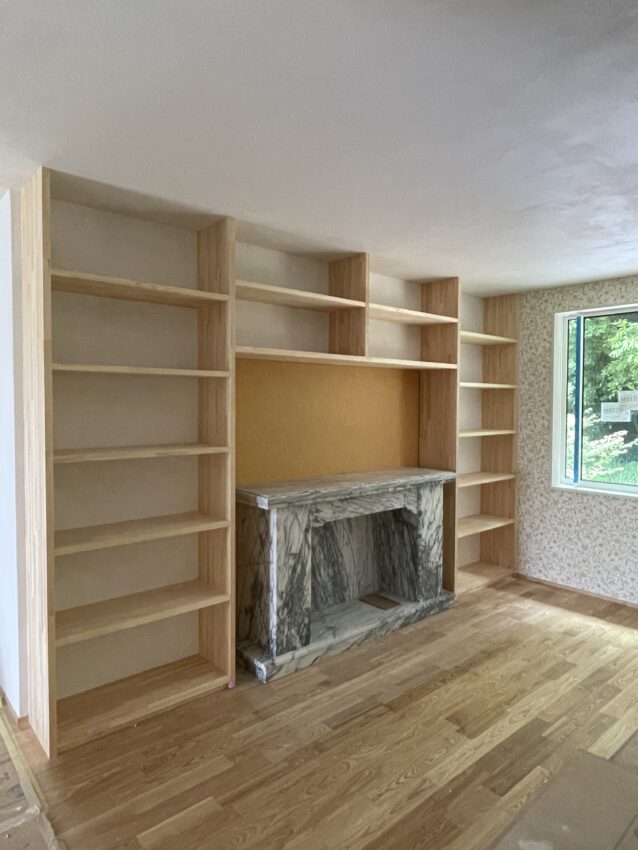 家の中央に皆が集えるフリースペースを設けました。応接室にあった大理石の炉台を移設しました。