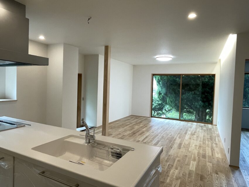 対面キッチンに改修し、北側、東側の庭を眺められるLDKをつくりました。