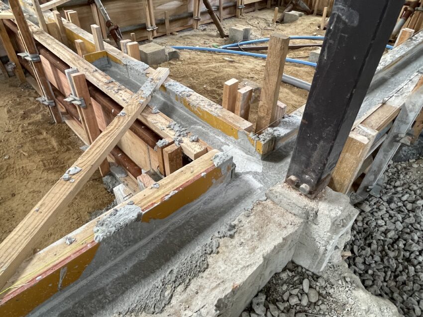 上部構造の鉄骨は健全でしたが、コンクリートの基礎の劣化が進行していましたので、新しい鉄筋コンクリート基礎を合体させて補強しました。