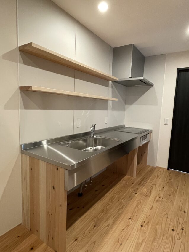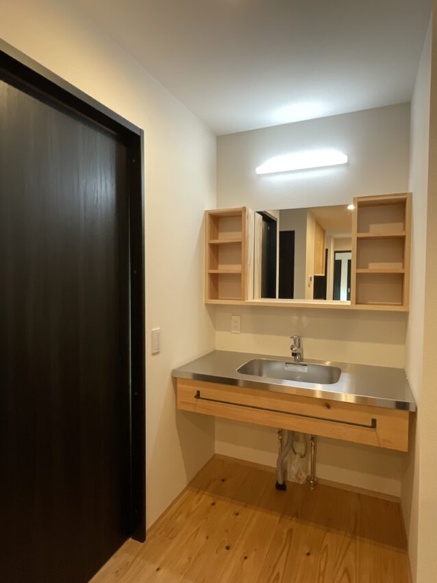 キッチンや洗面台はステンレスと木製パネルで造作しています。