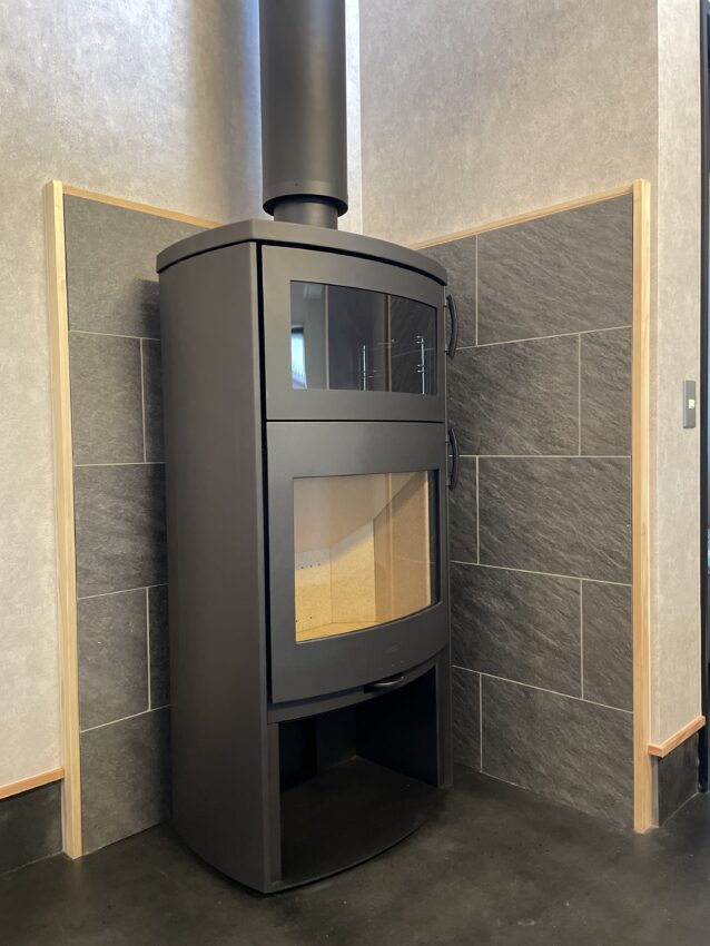 薪ストーブはHETA・エクリプス・オーブン。スリムながら高火力のストーブで空間を暖めます。
