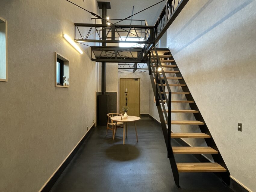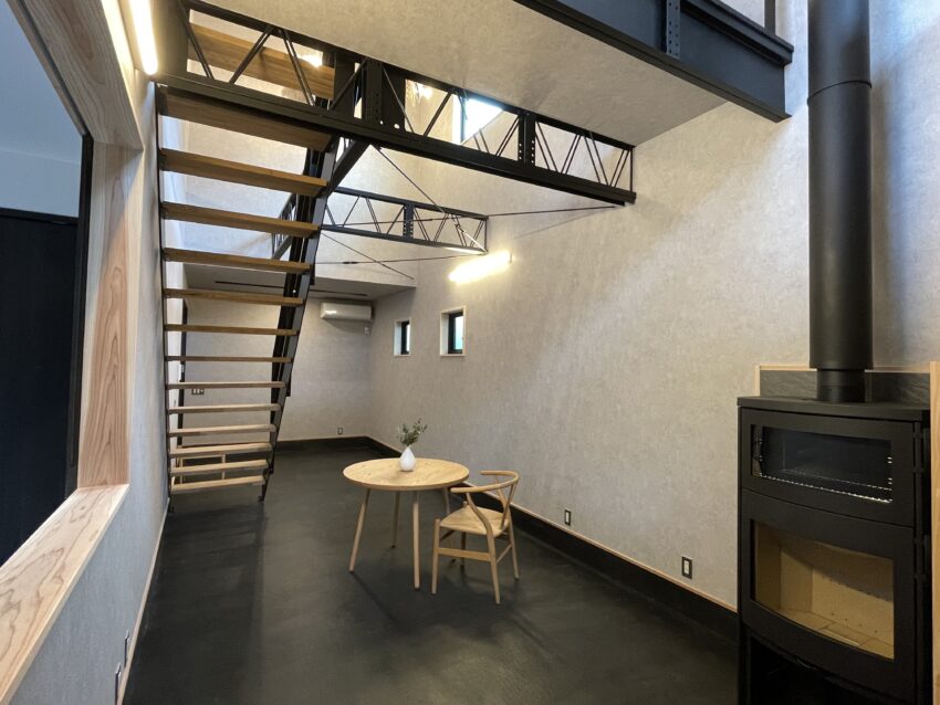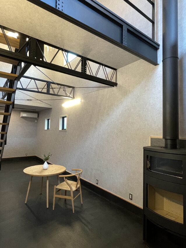 約55年前にハウスメーカーが建てた軽量鉄骨造の住宅をこのたび全面改修いたしました。ショップスペースも設けた店舗兼用住宅にリノベーションしています。既存の玄関はショップのエントランスになり、2階の床を撤去して吹抜のある空間としました。既存の鉄骨梁やブレースなどは現してインテリアの一部としています。スチール製の階段や、薪ストーブも空間の彩となっています。鉄骨造ならではのリノベーション空間をぜひご体感いただければと思います。