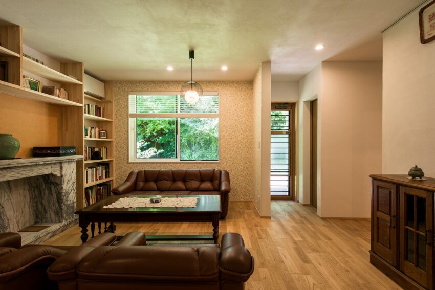 広々した玄関ホール。既存の暖炉台を移設して、本棚を造作しました。西の窓から植栽の緑が映えます。