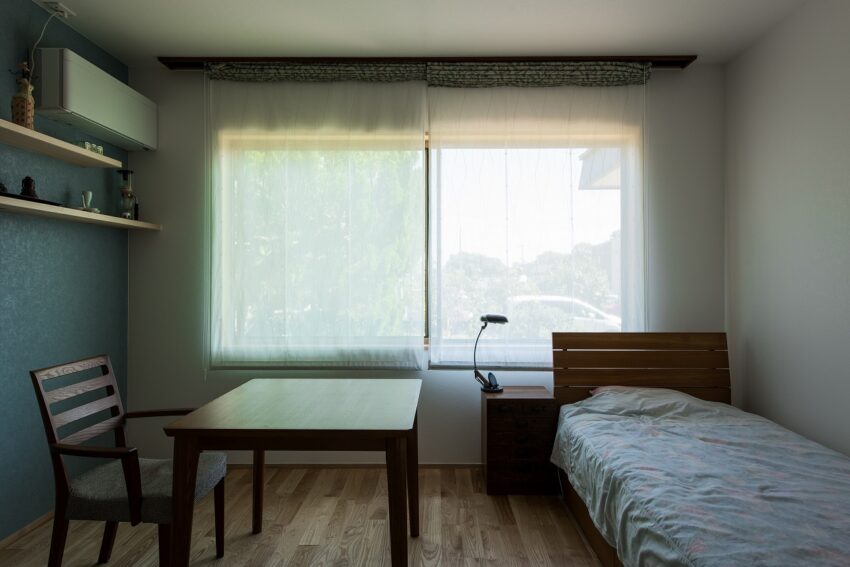 寝室。床と天井の既存仕上げを残しながら、しっかりと断熱施工を行っています。