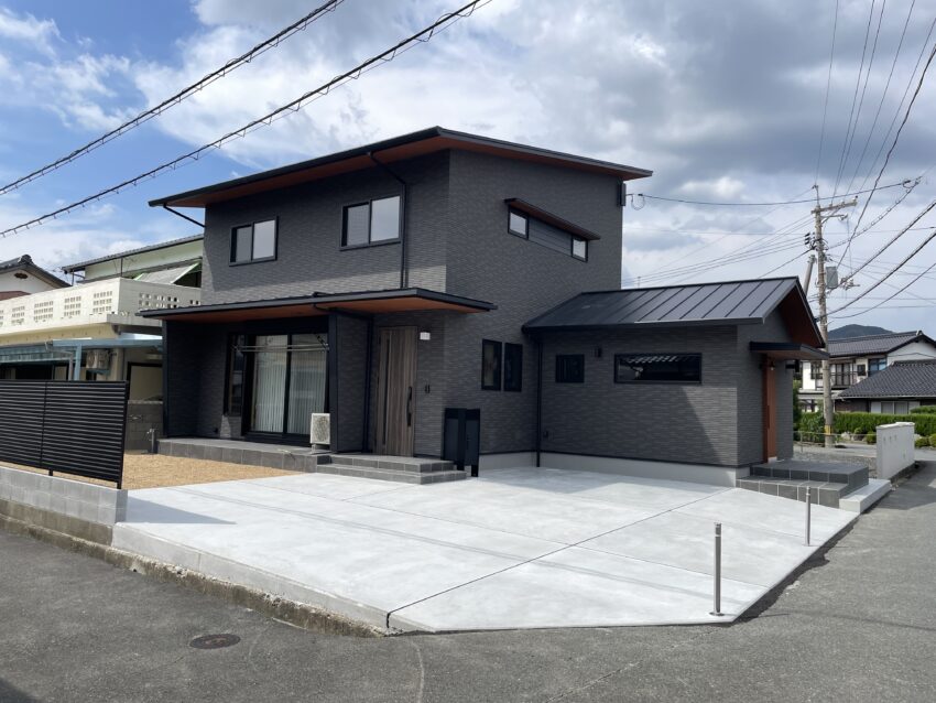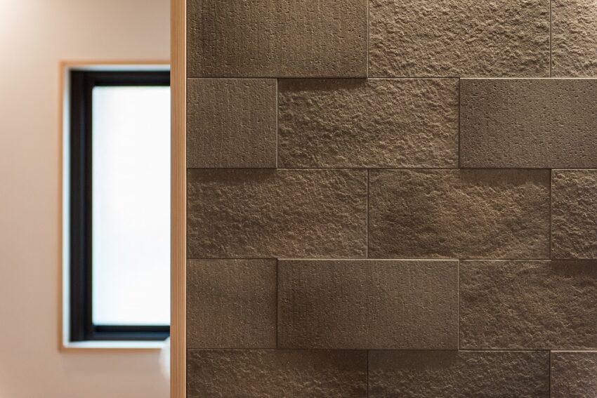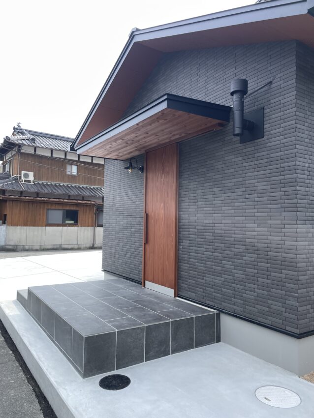 建物外観。片流れの住宅部と切妻屋根の珈琲小屋で構成されています。外壁はタイル仕上げです。