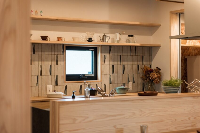 防府市にて、木造2階建住宅を新築しました。シンプルに計画しており、正方形総2階32坪の住宅に、正方形平屋5坪の珈琲小屋が付属した建物です。住宅プランもシンプルで、1階にLDKと小上がり和室、2階に個室を設けています。南側に設けた開口部からは自然光がたっぷりと入ります。夏の日射遮蔽として大きな庇も設けました。珈琲小屋は切妻屋根のかたちを天井にも現しとして、木の小屋の雰囲気を感じられる空間をつくりました。外部、内部に使用したタイルの表情が建物のデザインとなっています。