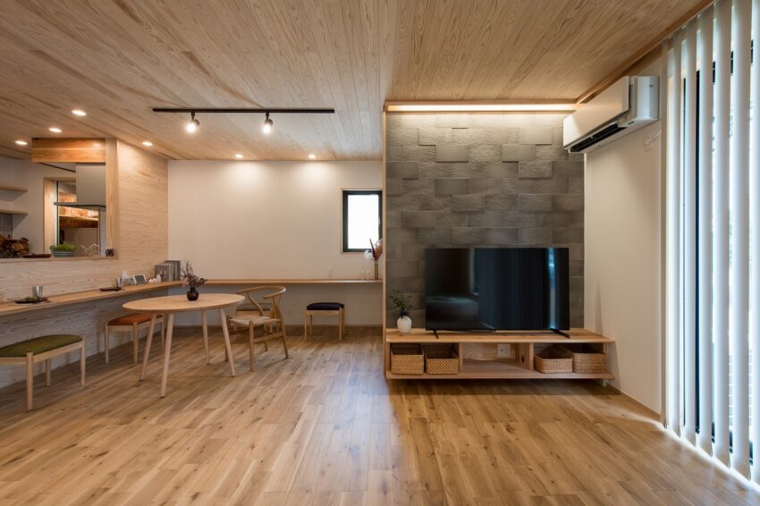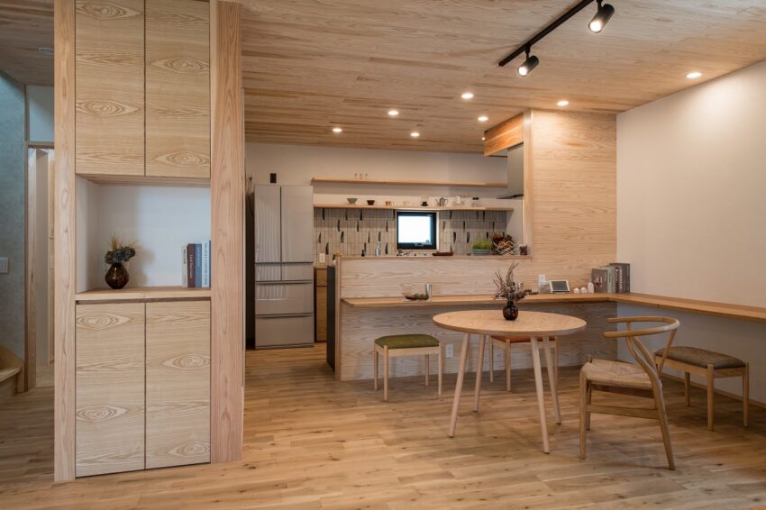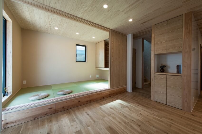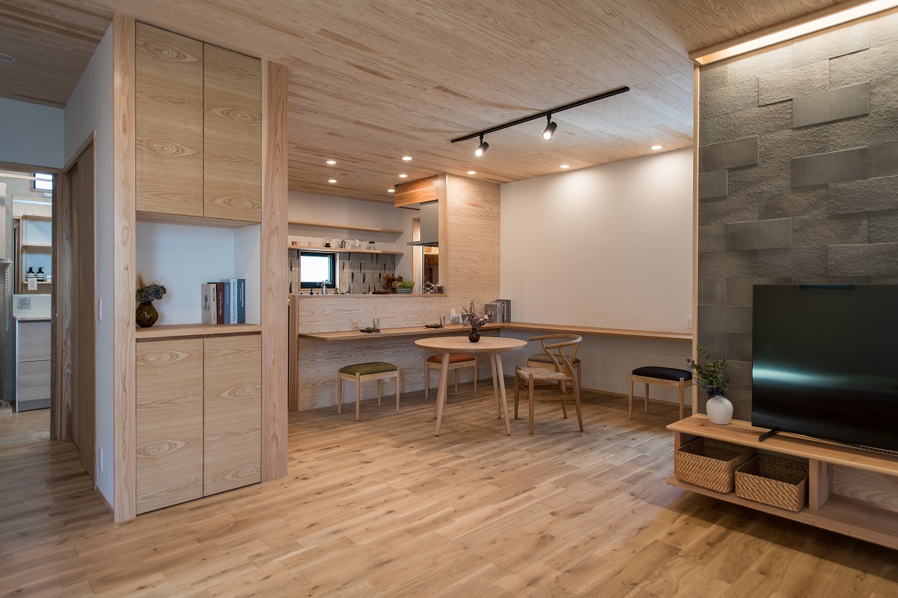 小上がり和室のあるLDK。木や珪藻土などの自然素材で内装を仕上げ、収納などは木製造作家具をしつらえています。