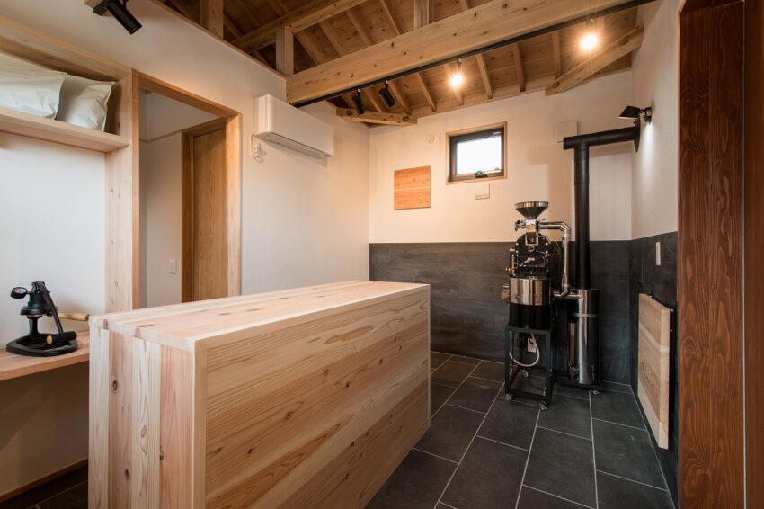 珈琲小屋はコンパクトですが、杉の屋根野地板を化粧現しにして天井高くしています。木の香り溢れる空間です。
