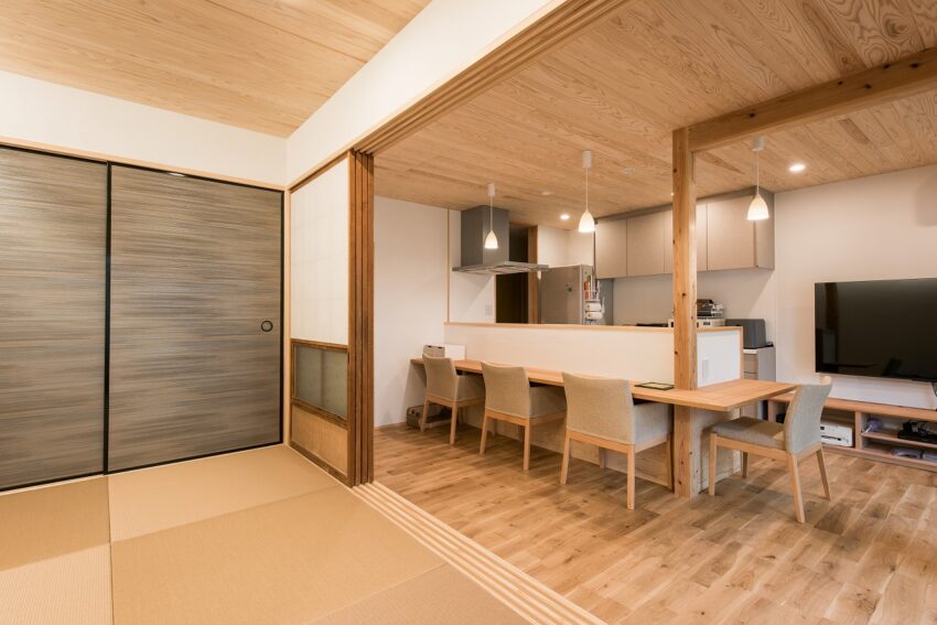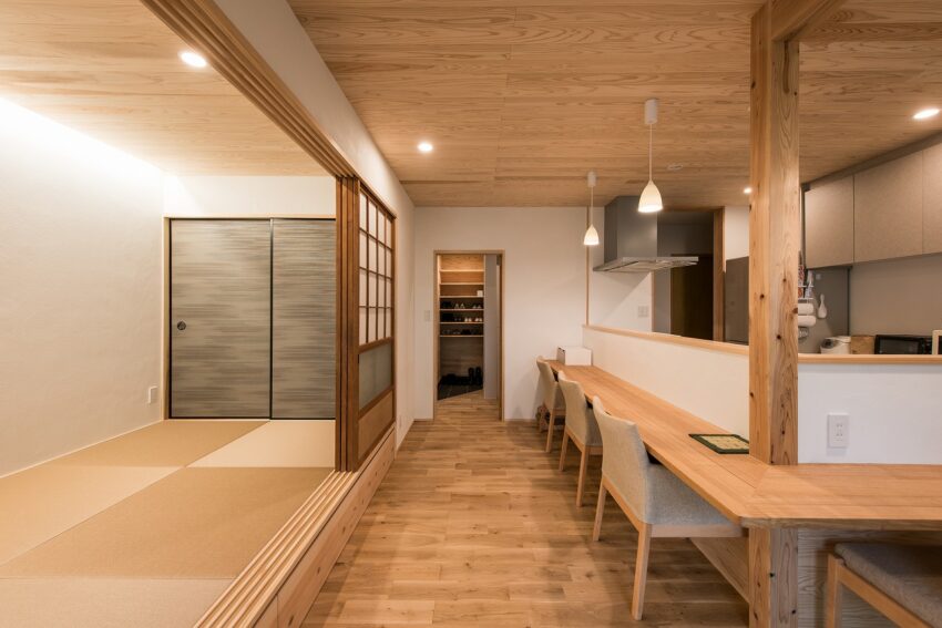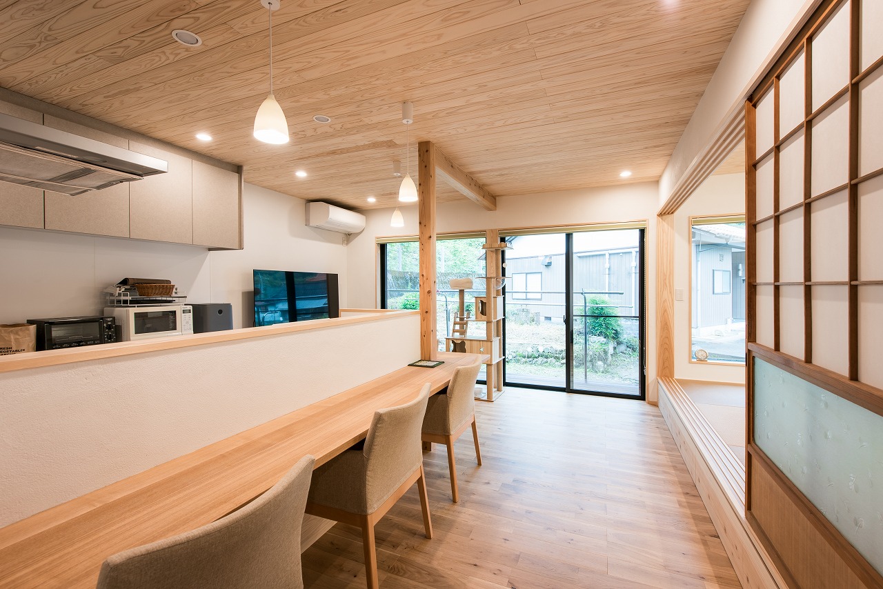 小上がり和室のあるダイニングキッチン。キッチンを囲むカウンターテーブルはタモ材で制作しています。