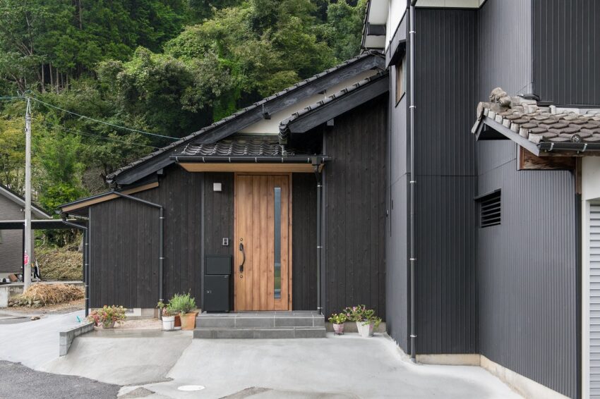 山口市に隣接する島根県吉賀町にて、築50年の木造住宅を全面改修しました。中古住宅だった建物は24.5坪の小さな平屋です。リノベーションしてご家族と猫が暮らす住まいをつくりました。元々道路の反対側にあった玄関を手前に変更し、付属する車庫からアクセスしやすくしています。南側に配置したダイニングはカウンター型としてキッチンを囲んで食事が楽しめます。小上がり和室やウッドデッキなども設けて、小さいながらも居場所がたくさんある住まいです。